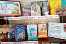 Вторая часть книжной выставки посвящена слабой половине человечества. Праздничное настроение помогают создать книги современных российских писательниц: А. Марининой, Т. Устиновой, В. Токаревой, Н. Андреевой, Е. Вильмонт и др. Все эти авторы, каждая по-своему, раскрывает в женщине её самые лучшие природные качества: богатый внутренний мир, ум, заботу, терпение и милосердие.