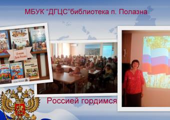 Родина! Это слово с детства знает каждый и потому празднуется ее день всей страной. Внесли свои лепту и сотрудники библиотеки п. Полазна. Приняли участие в флешмобе «Окна России», подготовили книжную выставку «Россией гордимся, России верны!», провели видеоурок «Россия – ты великая держава» для детей пришкольного лагеря...