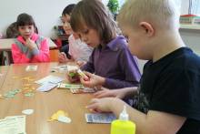В завершении занятия девчонки и мальчишки принялись мастерить закладки «Самые волшебные слова». Ребята приклеивали вежливые слова и картинки, помогая друг другу в работе.
