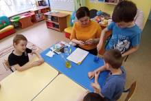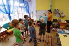Незнайка старался не только слушать, но и задавать вопросы, а также развлекал ребят разными играми, такими как пальчиковая гимнастика «Рыбка плавает в водичке», игра «Буль-Буль», веселая игра «Это я, это я, это все мои друзья» и др.