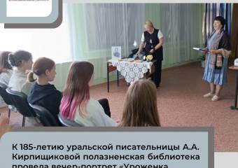 11 сентября большой зал библиотеки Полазна преобразился в литературно-историческую гостиную XIX века. На мероприятии, посвященном 185-летию со дня рождения уральской писательницы А.А. Кирпищиковой, для семиклассников Полазненской школы№1 было рассказано о жизни и творчестве именитой землячки, о том, как её имя связано с историей поселка.