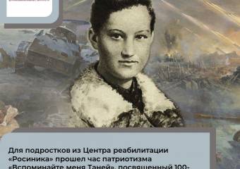 11 сентября для подростков из Центра реабилитации «Росиника» прошел час патриотизма «Вспоминайте меня Таней», посвященный 100-летию со дня рождения Зои Космодемьянской – первой женщины удостоенной звания Героя Советского Союза. Сотрудник Центральной городской библиотеки рассказала о короткой, но яркой жизни юной партизанки Зои Космодемьянской.