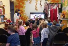 Библиотекарь в образе бабушки Матрены рассказала, как же жилось раньше на Руси нашим прабабушкам и прадедушкам, с помощью загадок и волшебного сундучка ребята познакомились с различными старинными предметами быта, играли в разные игры, такие как, ритмичные упражнения «На ложках, на ладошках», игра «Веретена» по системе «Монтессори». Ребята, играя, считали до 10, раскладывая «Веретена», тем самым запоминали цифры. А еще варили с бабушкой компот и борщ, танцевали с котом Васькой и многое другое. В конце мероприятия мальчишки и девчонки посмотрели мультфильм «День рождения бабушки».