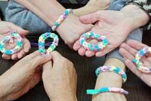 Особо обращаем внимание на развитие мелкой моторики. Участники клуба «Калейдоскоп» на очередном занятии плели из резинок для волос браслет. Перед занятием сделали самомассаж рук и пальцев – это улучшает координацию произвольных движений, восстановление ослабленных мышц, снятие излишнего напряжения.