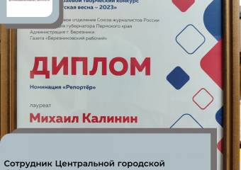 Сотрудник Центральной городской библиотеки, член Союза журналистов России Михаил Калинин стал лауреатом (победителем) Пермского краевого творческого конкурса «Журналистская весна – 2023» в номинации «Репортёр». Эта номинация была одной из самых многолюдных и собрала журналистов из самых разных городов и округов Прикамья.