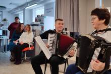Поддержку художникам оказали музыканты. Преподаватель по классу баяна Татьяна Бердникова и её ученик Матвей Почуйко исполнили музыкальные пьесы, как сольно, так и дуэтом.