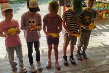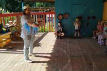 В игровой форме на летней площадке детского сада ребята вместе с Ветерком (переодетым сотрудником) путешествовали по улочкам любимого города, где на каждой остановке встречались с весёлыми арт-объектами «Добрячки», изображёнными на картинках. Около каждого добрячка ребята выполняли определённые задания и играли.