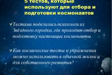 Ученикам были предложены испытания, которые проходят будущие космонавты в форме игры-тренинга. Ребята попытались удерживать равновесие с закрытыми глазами и определить самых стойких. Одним из испытаний было определение главных «космических черт характера», сильных сторон личности.