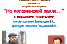 28 октября в 13-00 в библиотеке п. Полазна состоится творческая встреча с пермским прозаиком, поэтом Богомоловым Виталием Анатольевичем и прозаиком - краеведом Гладышевым Владимиром Федоровичем. Встреча с писателями, чьи книги пользуются большой популярностью у читателей – это большой, незабываемый праздник. Мы приглашаем жителей п. Полазна на встречу с авторами, где можно познакомиться с талантливыми земляками, узнать об их литературной судьбе, планах на будущее, приобрести книгу, получить автограф, сделать фото на память.