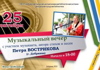 Друзья, приглашаем вас на интереснейшую встречу. Уже завтра, 25 октября, в Центральной городской библиотеке состоится музыкальный вечер с участием Петра Вострикова. Ждем вас!