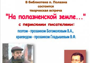 28 октября в 13:00 в библиотеке п. Полазна состоится творческая встреча с пермским прозаиком, поэтом Богомоловым Виталием Анатольевичем и прозаиком - краеведом Гладышевым Владимиром Федоровичем...