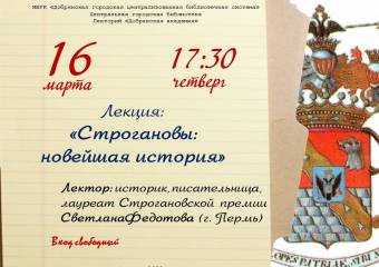 Центральная городская библиотека и лекторий «Добрянская академия» приглашают всех желающих 16 марта на встречу с историком, писательницей лауреатом Строгановской премии Светланой Федотовой (г. Пермь). Вход свободный.