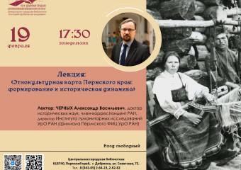 19 февраля в гостях у Центральной городской библиотеки Черных Александр Васильевич, доктор исторических наук, член-корреспондент РАН, директор Института гуманитарных исследований УрО РАН (филиала Пермского ФИЦ УрО РАН). Профессор Черных А.В. прочтет лекцию "Этнокультурная карта Пермского края: формирование и историческая динамика".