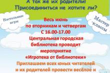 Приглашаем вас каждый вторник и четверг с 16.00 -17.00 принять участие в игротеке от библиотеки, а так же в мастер-классах.